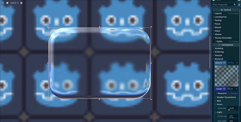 - The base StyleBox color's alpha is set to 0, and it has a blended border which has alpha set to 1,allowing for the shader to warp the edges more the closer they are to the edge