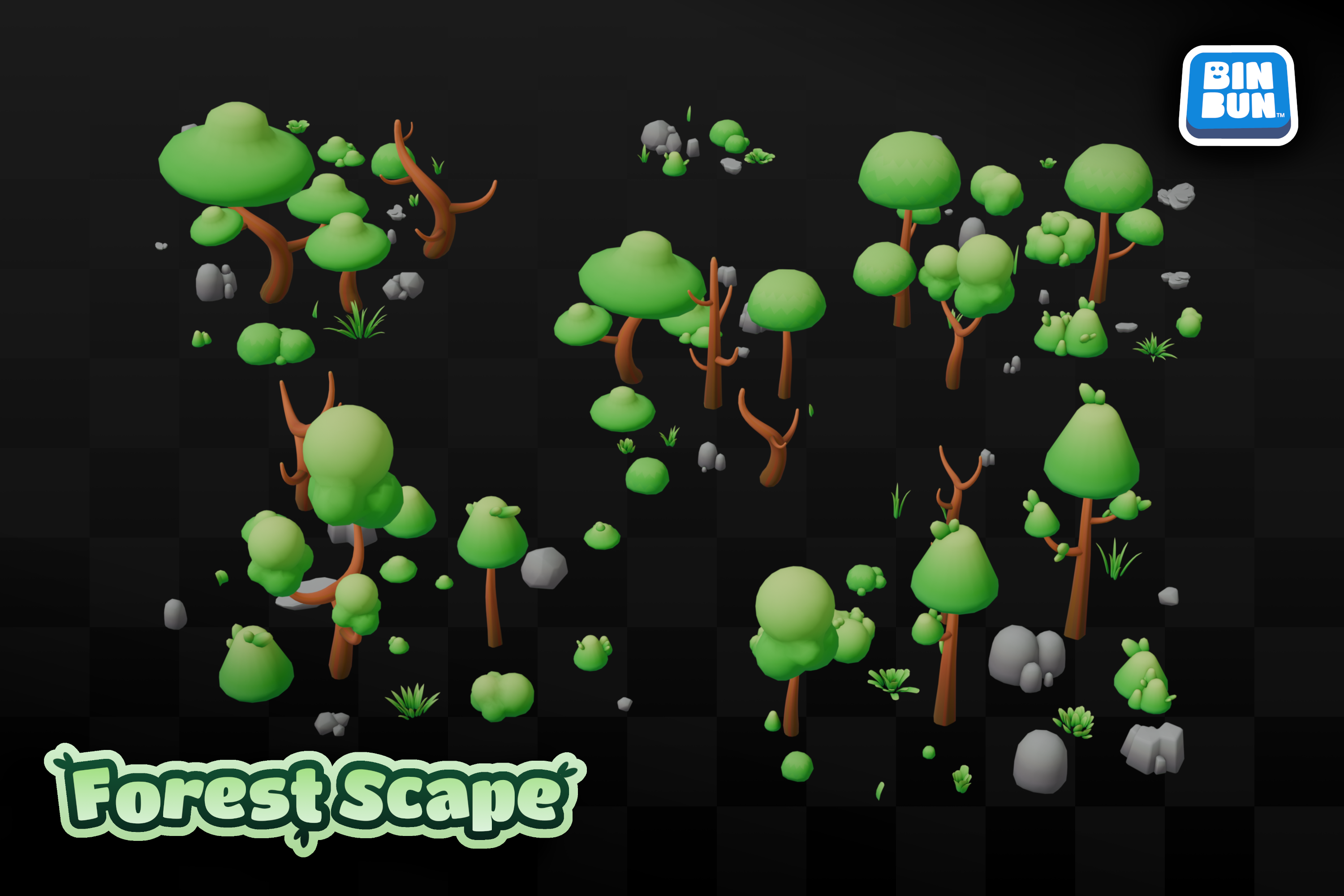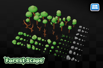 The Forest Scape is an asset pack of optimized low-poly game assets compatible with most game engines. The full package includes a variety of tree assets with different lengths and matching bush assets, rock assets of varying shape and size, grass assets and modular terrain.