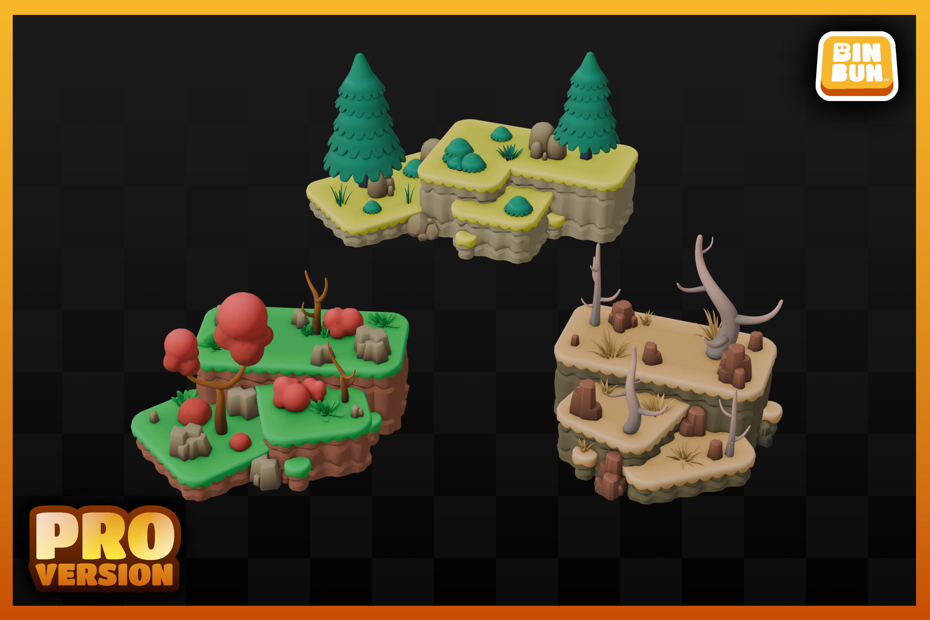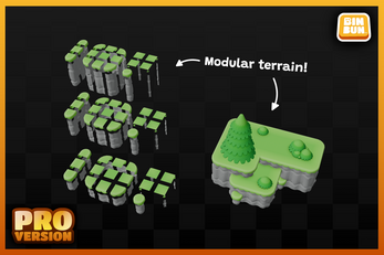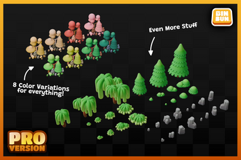 The PRO Version has double the assets totaling at 221 unique models with all of them having 8 color variations making the assets included reach an amount of 1768 total! This version includes additional trees, bushes, rocks along with modular terrain and optimized terrain presets.